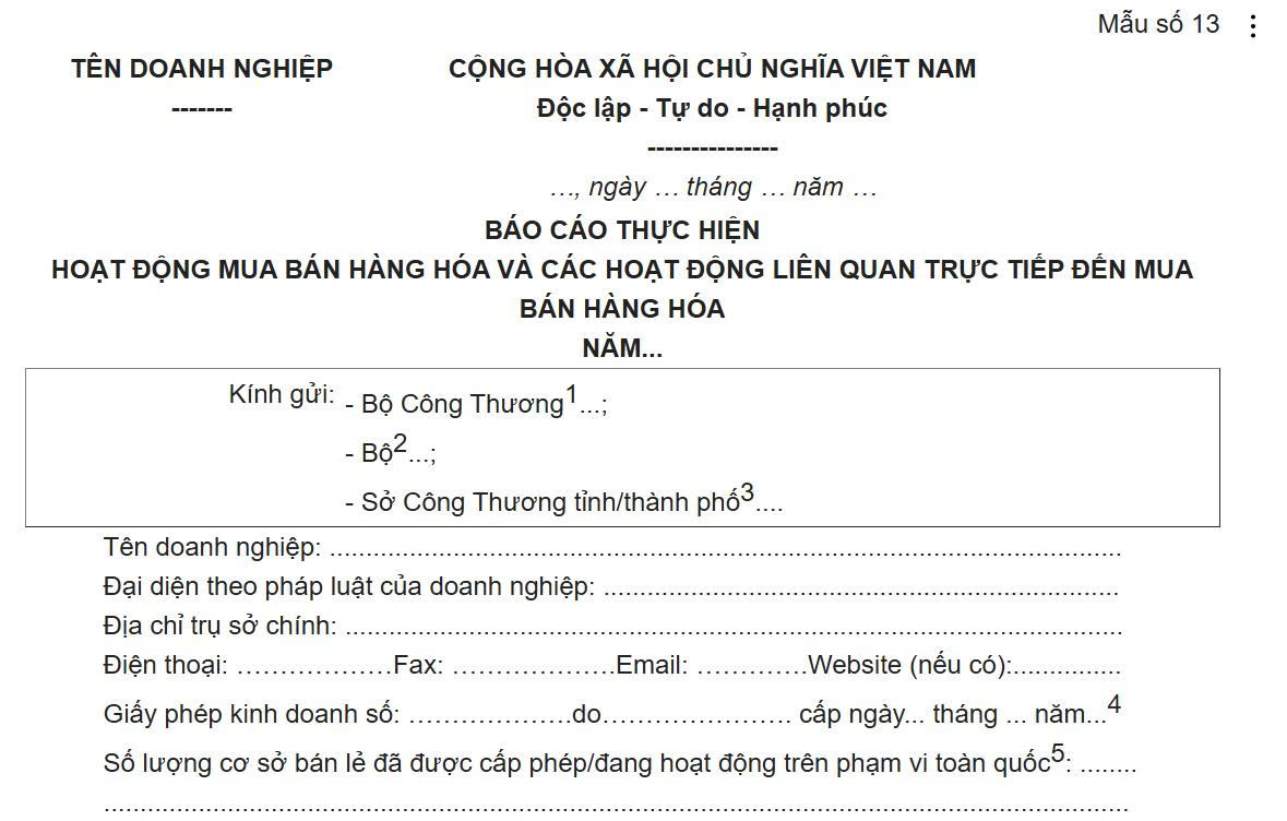 Báo cáo tình hình hoạt động mua bán hàng hóa và các hoạt động liên quan trực tiếp đến mua bán hàng hóa theo Mẫu số 13 tại Phụ lục ban hành kèm theo Nghị định 09/2018/NĐ-CP